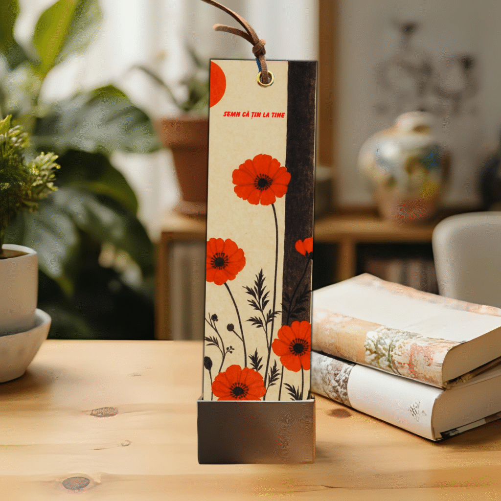 Pe acest semn de carte înflorește un singur mac roșu, delicat, dar plin de forță. În bătaia luminii, floarea pare să susure povești nespuse, amintiri ce se deschid la fiecare lectură. Macul devine o fereastră spre melancolie, dar și spre speranță, aducând o notă de poezie și frumusețe naturală fiecărei cărți pe care o însoțește.