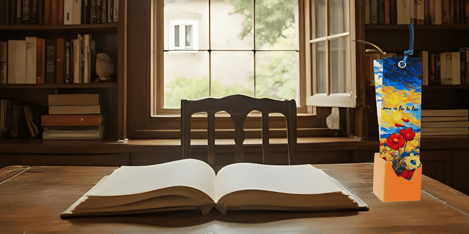 Pe marginea unei pagini se odihnește un stol de visuri, înălțându-se peste câmpul unde lumina se revarsă ca un cântec blând. Păsările, ca gândurile libere, se avântă spre orizonturi nesfârșite, purtând cu ele șoaptele poveștilor neterminate. Semnul de carte devine o punte între cer și cuvânt, între zbor și contemplare. Un simbol al libertății ce înflorește cu fiecare pagină întoarsă.